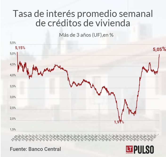 La noticia de "La Tercera" publicada esta última semana informa que las tasas de interés de los créditos hipotecarios en Chile han alcanzado un nuevo máximo en más de 14 años. Durante la segunda semana de noviembre, las tasas se situaron en un promedio de 5,05%, lo cual es el nivel más alto desde principios de abril de 2009. Este incremento marca un aumento de 0,53 puntos porcentuales comparado con el mes anterior, completando cinco semanas consecutivas de subidas y alejándose de los mínimos de 1,99% registrados a fines de 2019. Además, el escenario para la compra de vivienda se ve afectado por el aumento de la Unidad de Fomento (UF), que seguirá subiendo a pesar de la desaceleración de la inflación. Entre el 10 de noviembre y el 9 de diciembre, la UF aumentará en $145,85, llegando a $36.607,69, lo que implica un incremento de $1.743,77 en los últimos 12 meses.